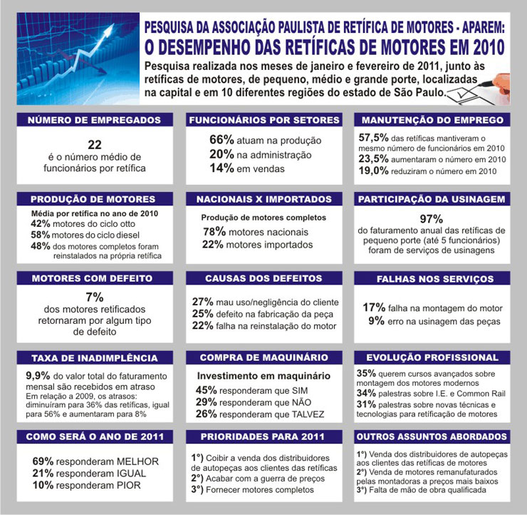 A Associação Paulista de Retífica de Motores (Aparem) realizou uma pesquisa com as retíficas de motores de pequeno, médio e grande porte em 11 diferentes regiões do Estado de São Paulo, incluindo a capital paulista.